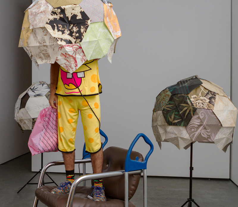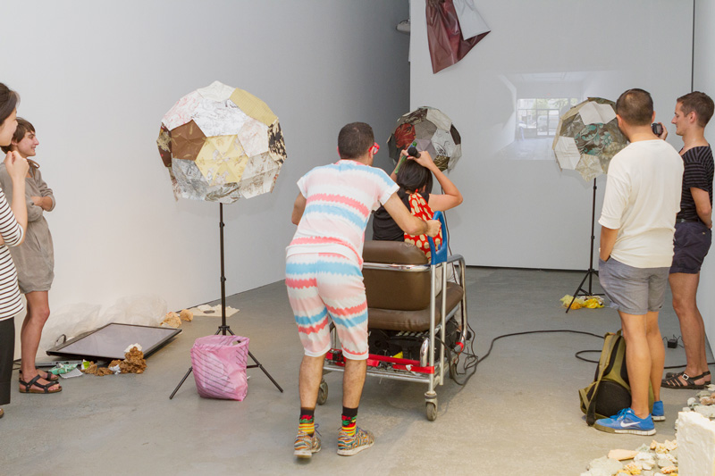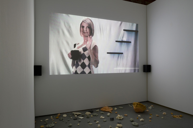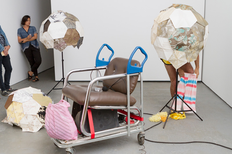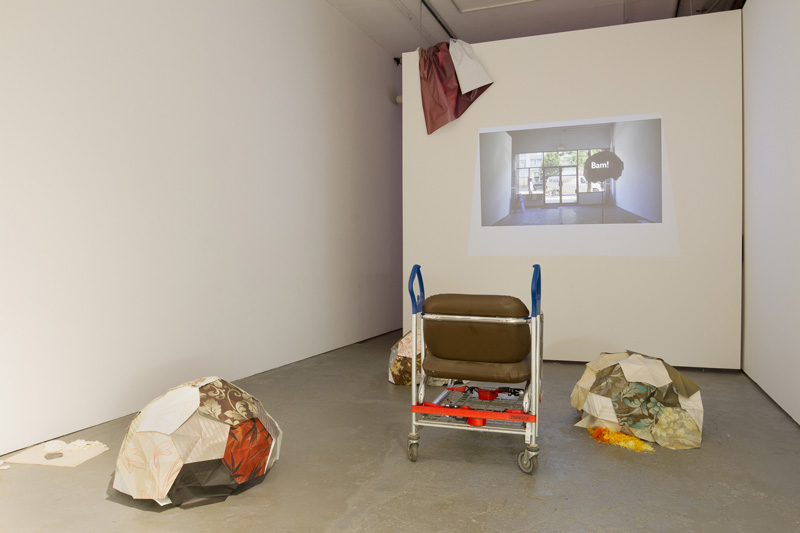 Mondo Pale Grey and Nouveau Peony, performance as part of the exhibition Architecture by Artists, 221a Vancouver. The viewer is seated on a rolling chair synced with the movement of the camera, moving towards and away from the screen. |
