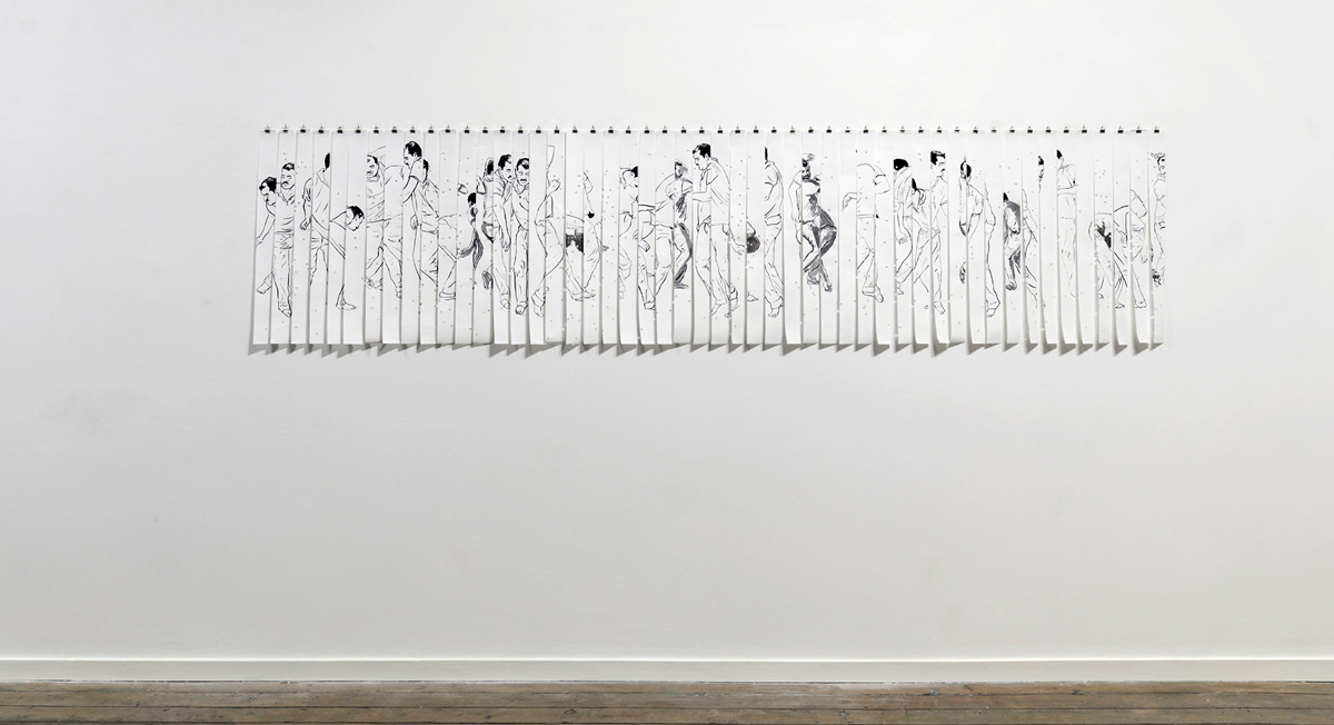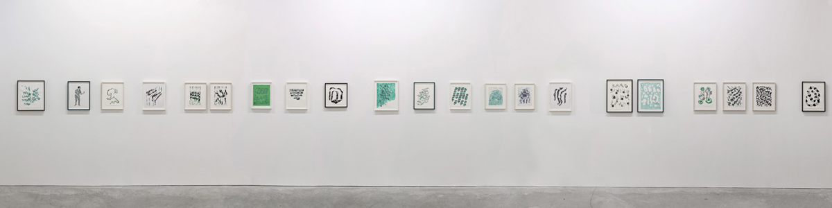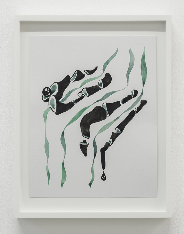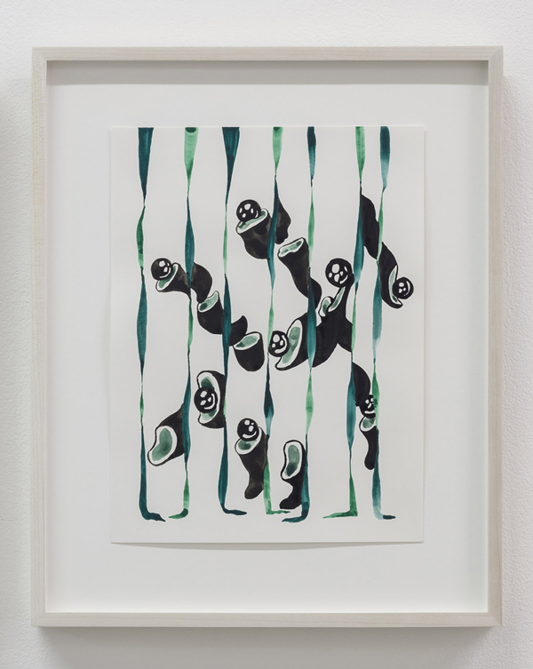 Of drawing, Wayne Koestenbaum writes that it is entirely liminal, a foundational element between thought and finished product. For him drawing remains "the incomplete, the incomprehensible, the noncitizen, the error, the throwaway." beside the point is far from an inquiry into irrelevancy, but like Koestenbaum's characterization of drawing Husain attempts to discard any "centrist" position through the medium itself. Instead these works on paper point (or don't point) to diffuse, unnamable positions articulated by multiple subjects, from the monstrous to the queer, or the "otherized" body. In one series, highly ornamented caricatures, idiosyncratic motifs, and exquisite corpse-like figures, all painted in black and viridian ink, morph, repeat and pulse over the paper. Their movement originates in film's rapid stutter but in turn develop their own repeating syntax. Alternately, in the Deepak series, which depict movements excerpted from a videotaped performance by dancer and choreographer Deepak Kurki Shivaswami, the dancer's repeated contortions articulate a different language altogether. |