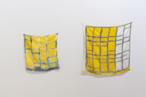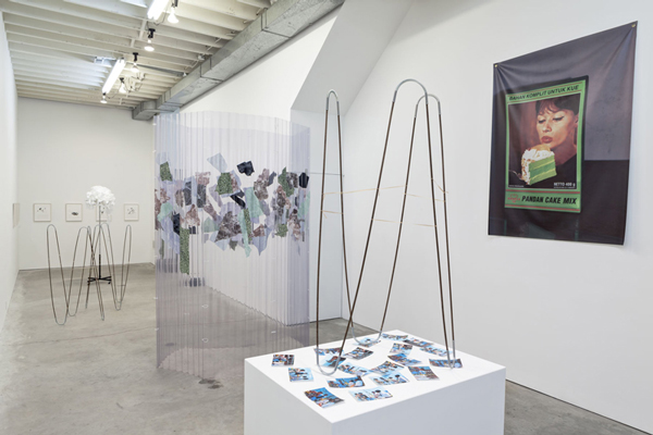 Husain’s second exhibition at Susan Hobbs gallery, titled Gebimsel, is organized around a theme particularly relevant to the shifting cityscapes of many urban centers: condominium living. Gebimsel is a German term that refers to dangling decorations, from garlands to beaded curtains, found in the home. Likewise, his assembly of “anti-architectural structures”, drawings, and silk paintings take cues from condominium showroom decor—items meant to give an empty architecture the impression of lived-in-ness, and more importantly, a lifestyle to buy into. The condo showroom, as a real-life venue or modeled in CGI, is the post-modern image passe-partout, and allows us to composite our own fantasy of day-to-day living into it. Accompanying the show is a custom poster depicting a box of Indonesian pandan leaf-flavoured cake mix paired with the intermittent playing of German popstar Alexandra’s 1968 schlager “Illusionen”. The incongruent collision of these two elements within Husain’s mock showroom emphasizes the melancholic air of his critique, yet they evoke the optimism of the 1960s as a comparison to the present. The promises of high rise construction then seem to have shifted now, especially in Toronto. As Husain writes, “It’s not that the leading critics of urbanism, like Richard Sennet and Jane Jacobs, are irrelevant now, but thinking about urban development in those terms doesn't apply any more now that we're surrounded by glass walls as given facts.” |